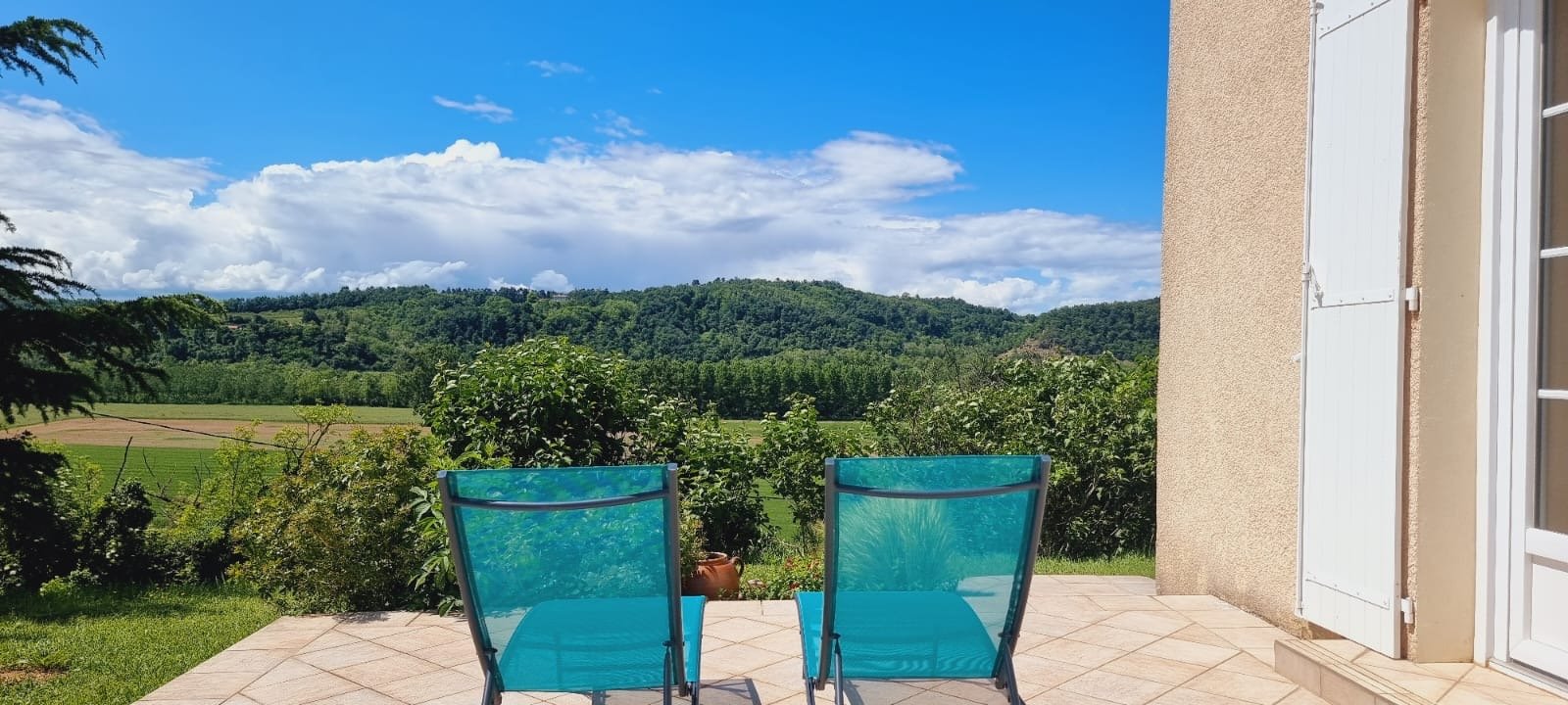 Terrasse avec vue sur la campagne, table, salon de jardin et cour intérieure