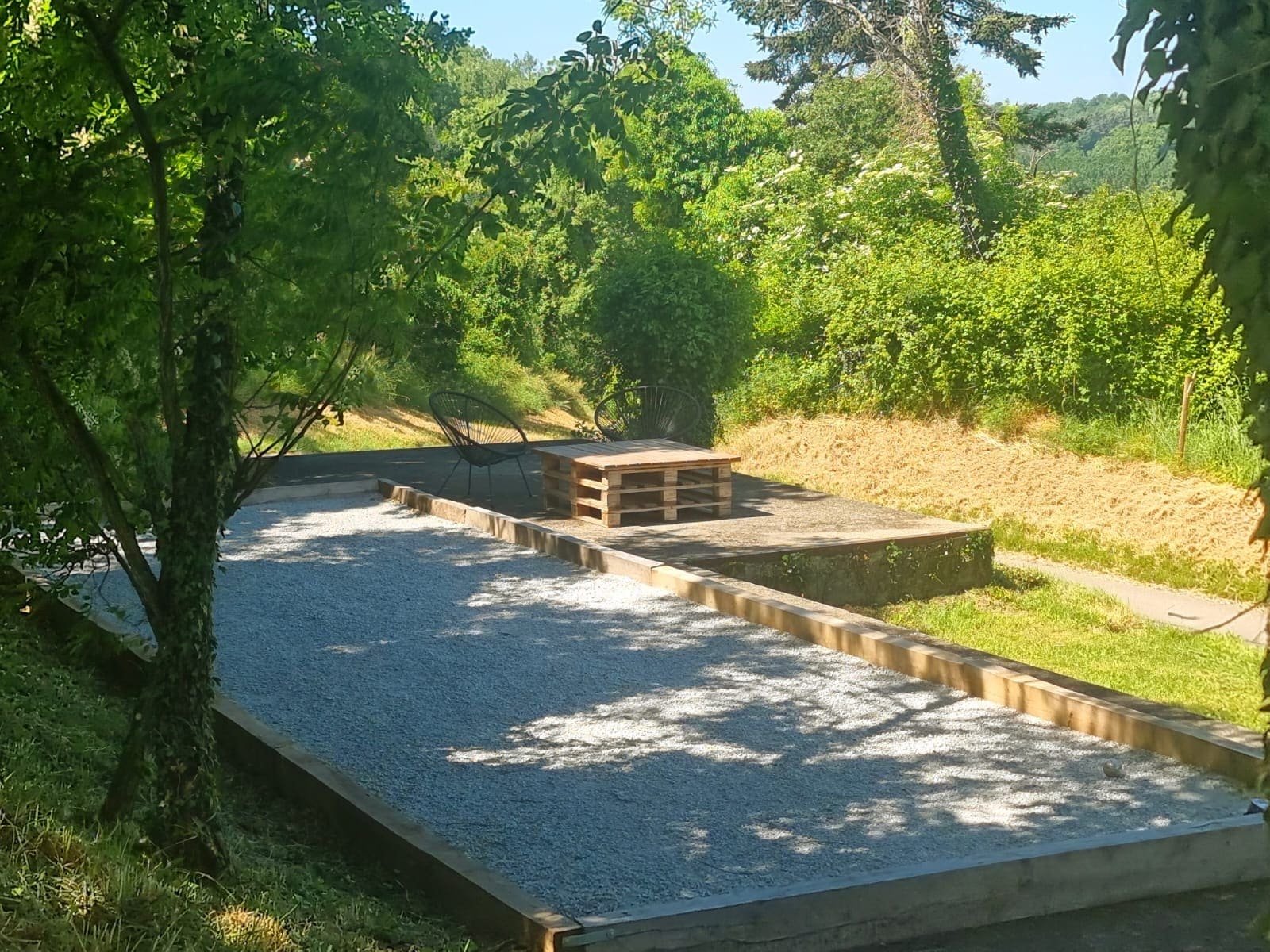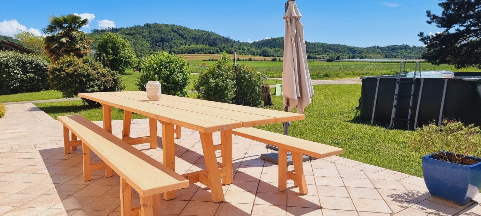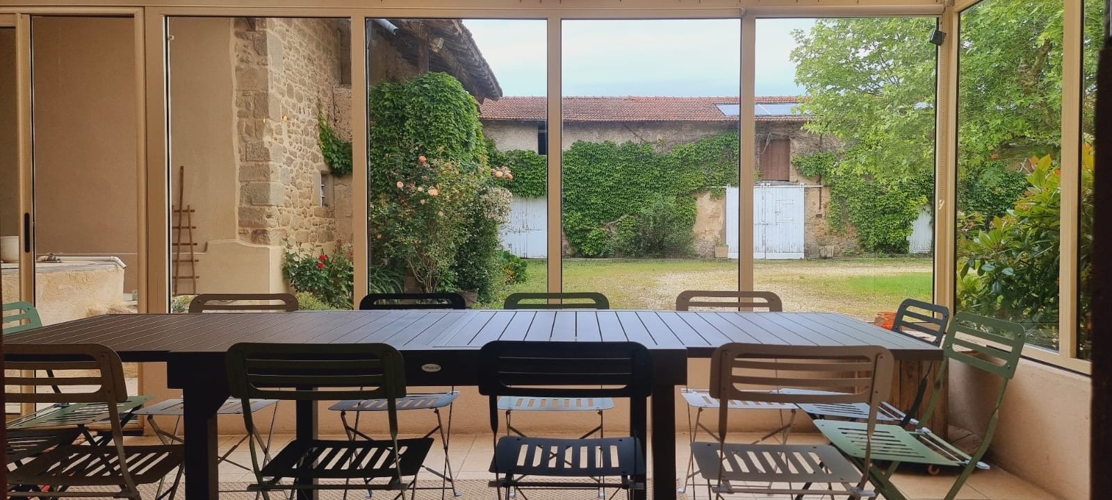 Terrasse avec vue sur la campagne, table, salon de jardin et cour intérieure